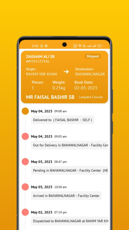 شپمنٹ کی تاریخ: لیوپارڈ کورئیر ٹریکنگ ایپ شپمنٹ کی تفصیلی تاریخ کو برقرار رکھتی ہے، جس سے آپ کو جب بھی ضرورت ہو ماضی کی ٹریکنگ کی معلومات تک رسائی حاصل ہو سکتی ہے۔ آپ پچھلی ڈیلیوری کا جائزہ لے سکتے ہیں اور اپنی ترسیل کے پورے سفر کو ٹریک کر سکتے ہیں۔