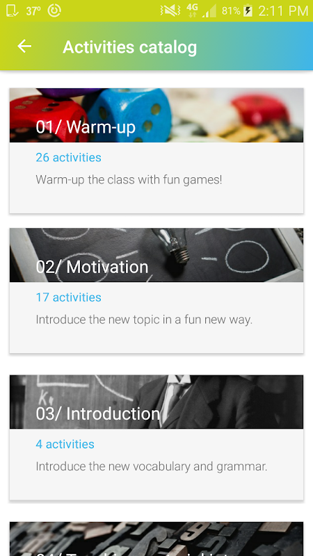 ایک استاد کے لیے بہترین امداد - نئے ESL وارم اپ، گیم یا کسی اور سبق کی سرگرمی کی تلاش میں وقت نہ گزاریں! ایک بلٹ ان ایکٹیویٹیز کیٹلاگ کے ساتھ آپ تمام سرگرمیوں کو نیویگیٹ کر سکتے ہیں اور اپنے اسباق کے لیے نئے آئیڈیاز حاصل کر سکتے ہیں بشمول: