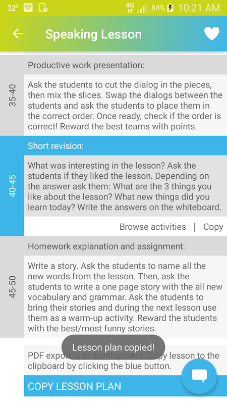 سبق کا منصوبہ ایک ایسی ایپلی کیشن ہے جو 50 منٹ کے انگریزی اسباق کی منصوبہ بندی کے سانچے تیار کرتی ہے (ایک سیٹ جدید طریقہ کار کے ڈھانچے کے ساتھ)۔ اسباق کے تمام حصے تقریباً تمام (کراس گریڈ) طلباء کی سطحوں کے مطابق بنائے گئے ہیں۔ ہر سبق کا حصہ 9 تصادفی طور پر تیار کردہ تفریحی ESL سرگرمیوں پر مشتمل ہے۔