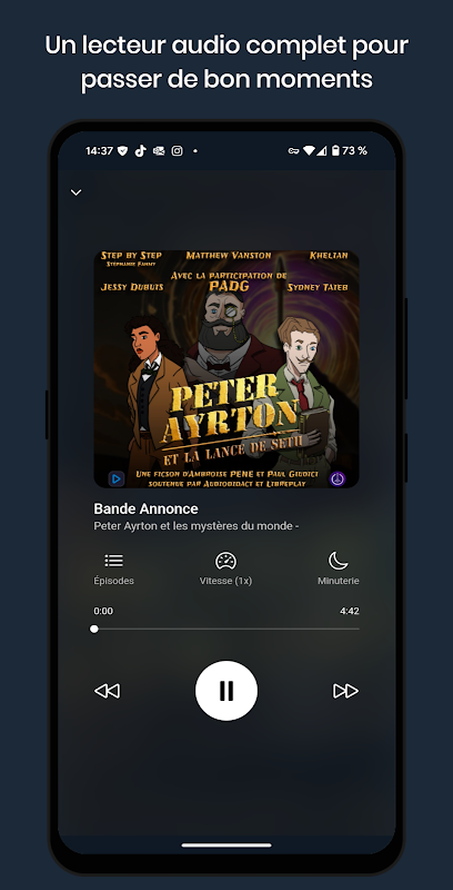 Libreplay سونور آزاد آڈیو فکشن کے لیے ایک اسٹریمنگ اور لسٹنگ پلیٹ فارم ہے، مکمل طور پر مفت اور قانونی۔ متعدد آڈیو کہانیوں کے ذریعے سفر کریں جو آپ کو ایسی دنیاوں تک لے جائیں گی جن کا آپ نے کبھی تصور بھی نہیں کیا تھا۔