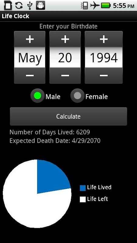 An animated pie chart gives you a visual representation of how much life you have left. You can also shake the phone to process your calculation.