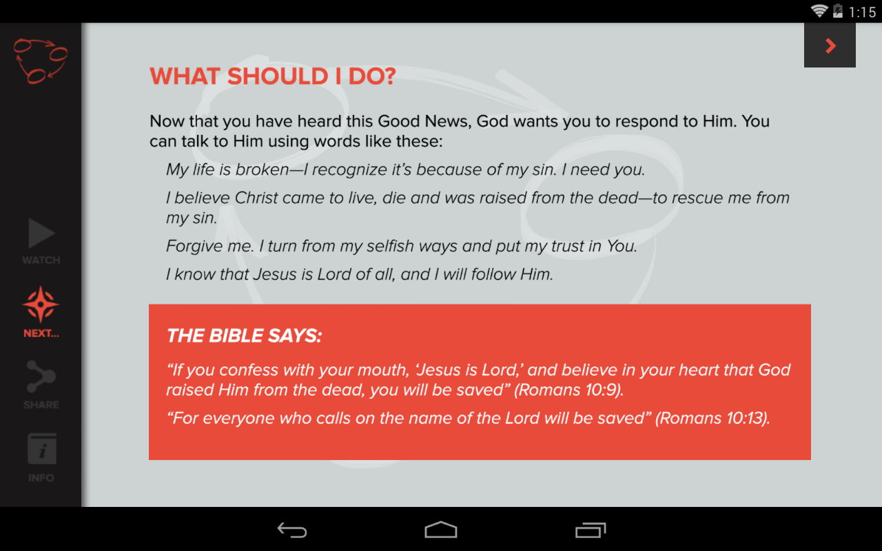 This APP is designed to help equip you to have conversations with people about Jesus. The LIFE CONVERSATION BUILDE APP helps answer the following questions in a simple and memorable way so that you can begin to naturally and actively share it with others.