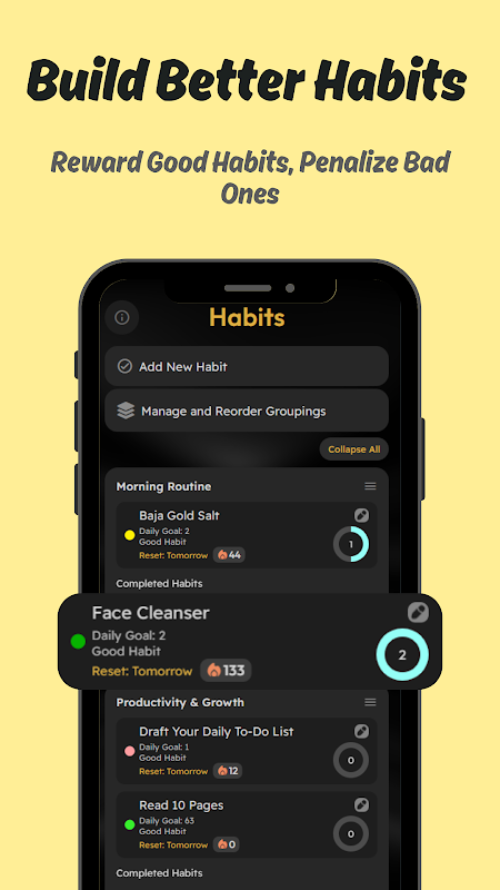 • اپنی مرضی کی عادات بنائیں — اچھی عادتیں پوائنٹس کا اضافہ کرتی ہیں، جبکہ بری عادتیں ان میں کمی کرتی ہیں۔