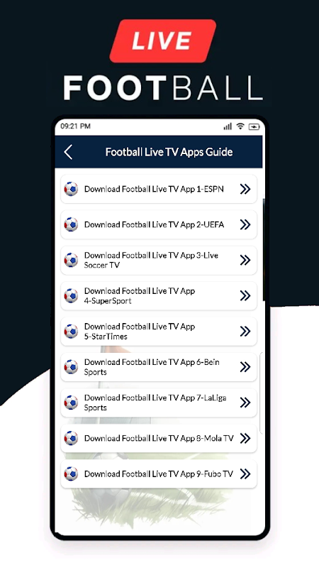 Live Football TV HD فٹ بال کے شائقین کے لیے ایک مفت ایپ ہے جو لائیو گیمز دیکھنے کے لیے کافی نہیں ہو پاتے۔ یہ استعمال میں آسان ایپ ہے جو آپ کو فٹ بال کے تمام براہ راست میچ دیکھنے کی اجازت دیتی ہے۔ فٹ بال-ساکر میچز تیز رفتار انٹرنیٹ صارفین کے لیے ایچ ڈی کوالٹی میں اور 3G صارفین کے لیے کم معیار میں براہ راست نشر کیے جاتے ہیں۔