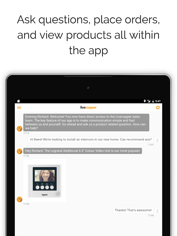 Simply chat to us with this app, preview products and engage with our staff. Ask questions, place orders, and view products all within the app.