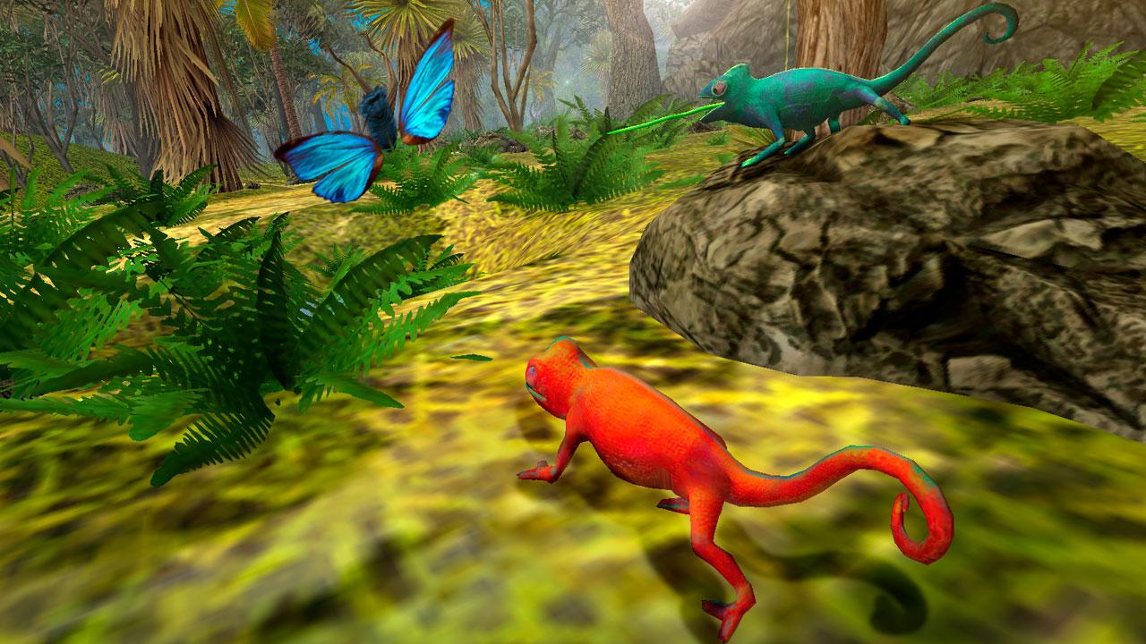 Become a wild lizard living in the rain forest! You can be a bright colorful chameleon or a little nice gecko. You have a lot of natural enemies: giant tropical spiders, wild cats, foxes, and other big and strong predators. Fight them when they attack or run away and hide! Control your physical condition by watching over the health, stamina and food indicators. Hunt flies, bugs, bees, and many other different insects to keep your chameleon or gecko well-fed and fit.