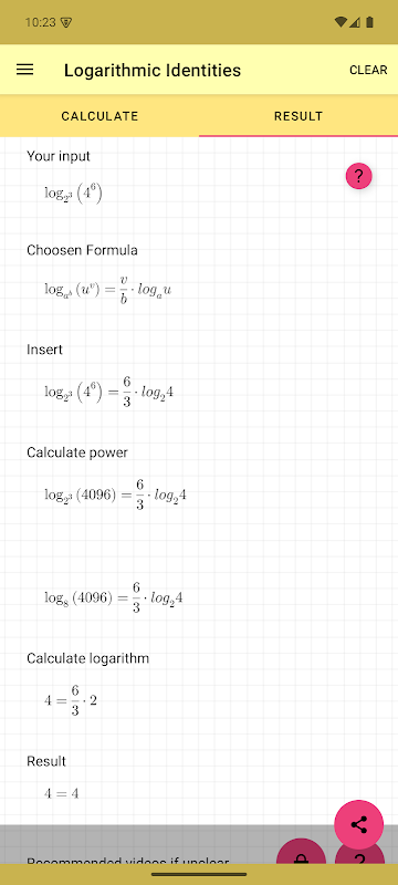 بہت سے معاملات میں آپ لوگارتھم کو تبدیل کرکے اور اس کی شکل بدل کر حساب لگا سکتے ہیں۔ یہ ایپ بنیادی کاموں پر فوکس کرتی ہے: اضافہ، گھٹاؤ، ضرب، تقسیم اور لوگارتھم کی بنیاد کو تبدیل کرنا۔ آپ کو تمام اقدار درج کرنے کی ضرورت ہے اور ایپ لاگرتھم کے حساب کے کچھ اصولوں کا مرحلہ وار استعمال دکھاتی ہے۔ وہاں آپ دیکھتے ہیں کہ کس طرح لوگارتھم کی تبدیلی حساب کے آسان طریقے کی طرف لے جا سکتی ہے لیکن اسی نتائج کے ساتھ۔ ایک انفوگرافک لوگارتھم کے حساب کے تمام اصولوں پر مشتمل ہے۔