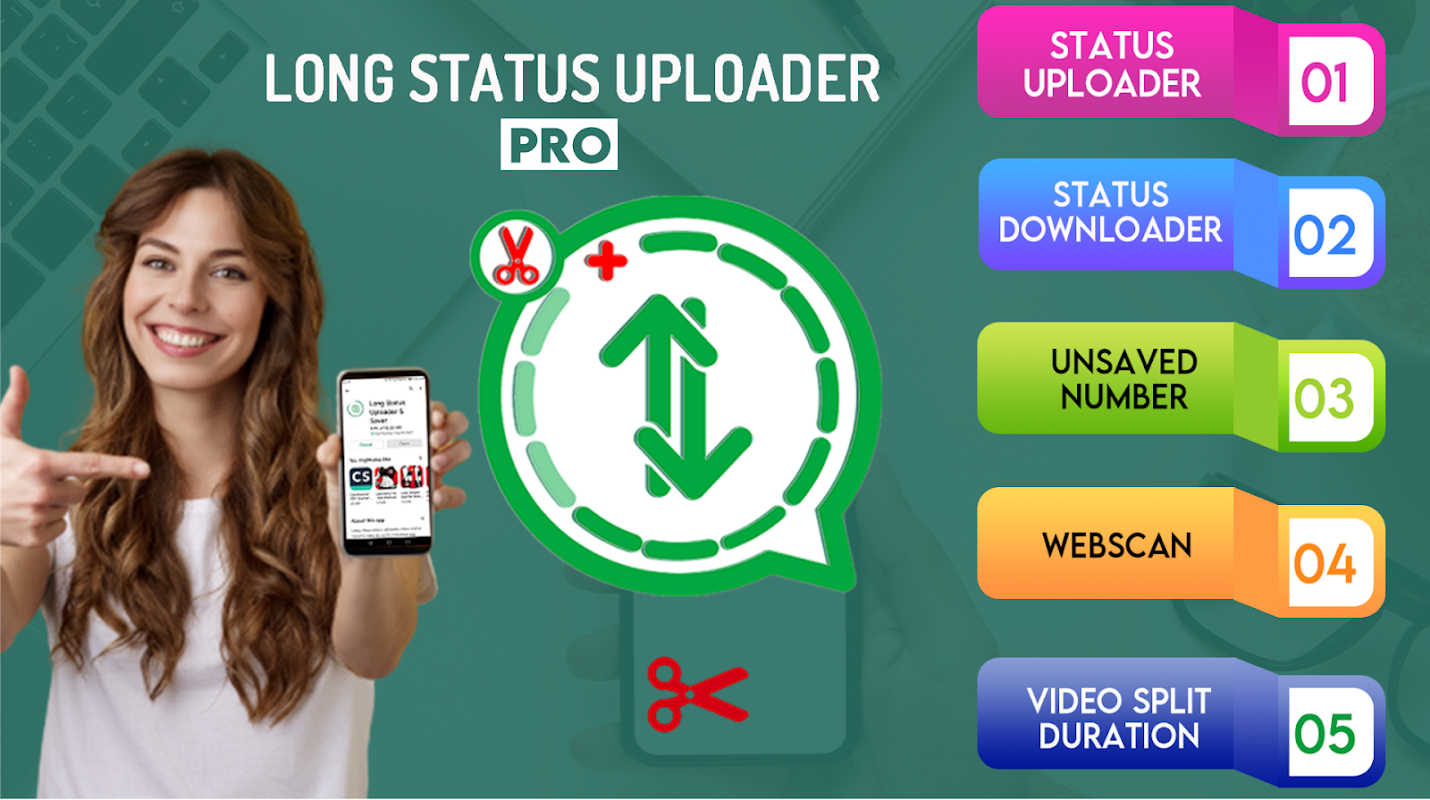 لانگ سٹیٹس اپ لوڈر کو سٹیٹس پر لمبی ویڈیوز پوسٹ کرنے کے لیے استعمال کیا جاتا ہے۔ اب آپ اپنے اسٹیٹس پر 30 سیکنڈ سے زیادہ کی ویڈیو آسانی سے اپ لوڈ کر دیتے ہیں۔ ایک مکمل ویڈیو اسٹیٹس اپ لوڈر، اسٹیٹس ڈاؤنلوڈر، ڈائریکٹ چیٹ اور واٹس ایپ ویب کی خصوصیات۔