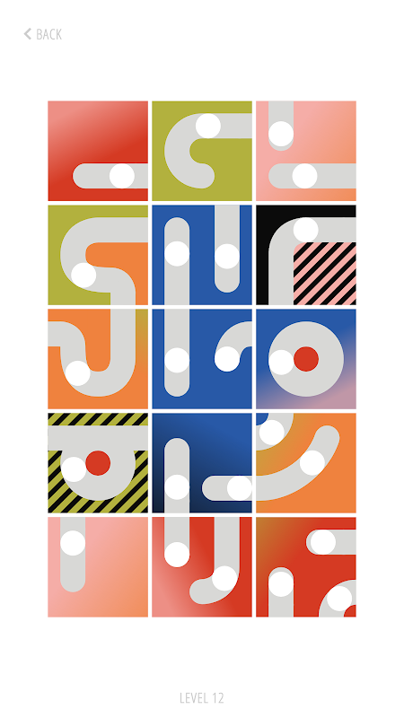 Create colourful animated loops in this relaxing and easy-to-learn puzzle game. Tap a tile to make it rotate and make sure that all tiles together create a seamless looping animated flow. The sides of each tile should match the looping animation of all neighbouring tiles to achieve a perfect flow. There should be no loose ends. Keep rotating the pieces to connect all the lines, creating a closed shape pattern with a looping animation. Watch the shape come magically alive when all animations connect to each other.