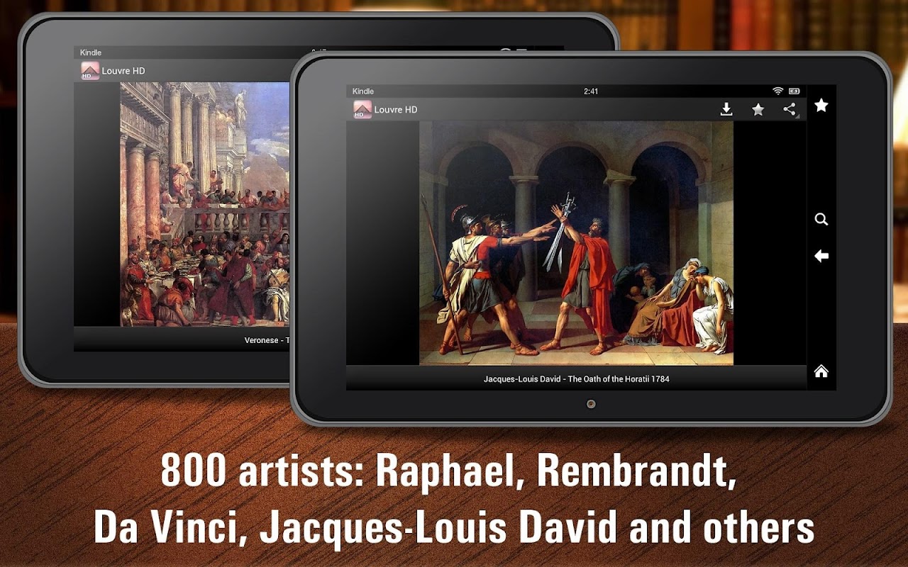 The application contains a collection of 2300 paintings of the Louvre Museum. Here you will find the works of Raphael, Rembrandt, Da Vinci, Veronese, Delacroix and many other eminent masters of painting.