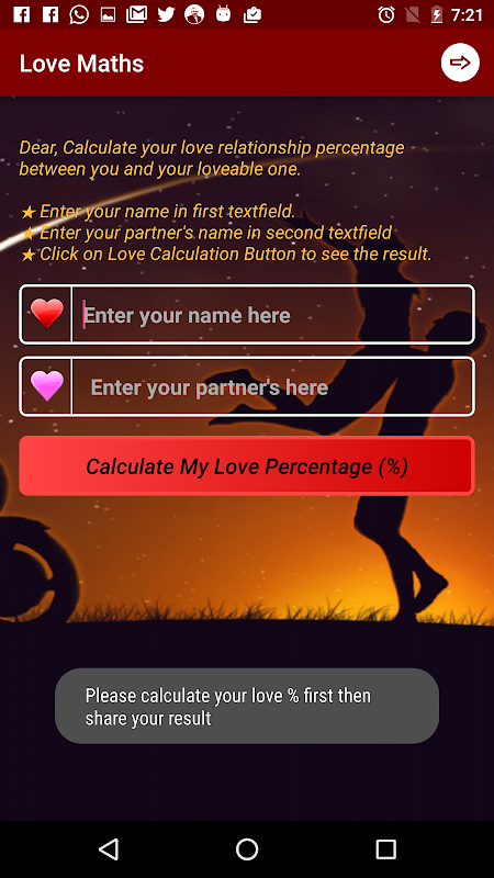 Love Calc/Calculator, an app is for calculating love percentage between you and your dear lovable partner.