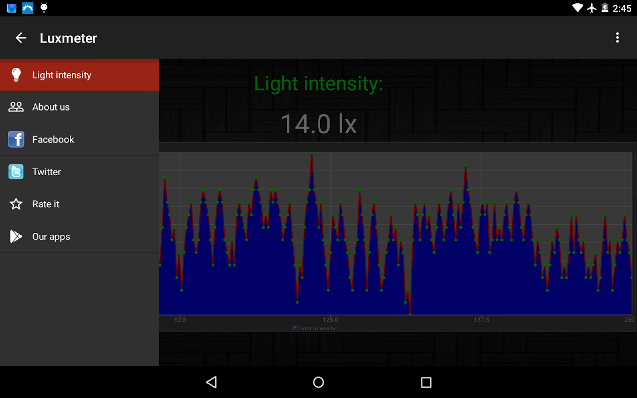 Luxmeter is an Android app which measures light intensity accurately. Just download and open the app. If your device has light sensor, application start to measure light intensity automatically. Measuring unit is lux (lx).