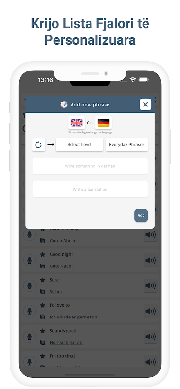 Me frazat e përshtatshme për shtëpinë, punën, udhëtimin dhe më gjerë, do të keni gjithmonë fjalët e duhura në dorë. Pavarësisht nëse janë përshëndetje, ngrënie, kërkimi i udhëzimeve ose lundrimi në mjediset sociale, aplikacioni ynë ju pajis për të komunikuar me besim.