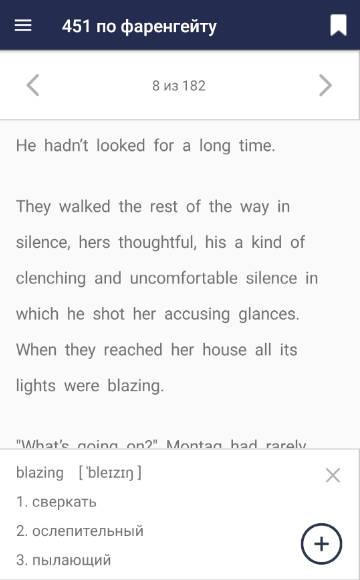 К слову о встроенном переводчике - при чтении книги на английском языке, он даст вам перевод любого слова на русском языке в нескольких вариантах, что делает чтение проще чем к примеру адаптированные книги Ильи Франка, и позволяет понимать прочитанное не отрываясь от самого сюжета книги.