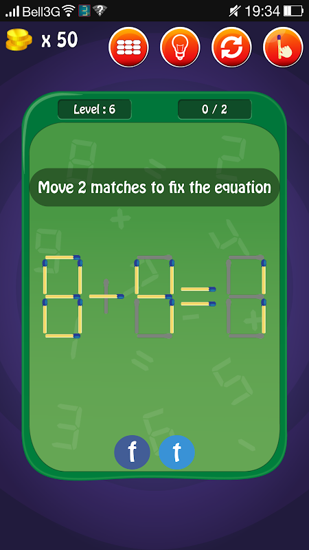 It boasts more than 100 levels and even more levels are added regularly! In each level, the player needs to move 1 or 2 matches to fix the otherwise wrong equation! If you got stuck, you can get hint from the system or ask your friends on Facebook or Twitter to help you via links like this: http://www.magicmatchmath.com/magic_panel/site/show_level/3