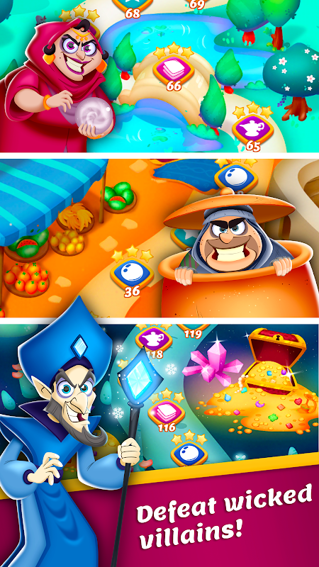 • Engage in fun matches against whimsical villains featuring Devas Djinn, Jinn Unseen, Melissa Sorceress, Scar Wizard and other fun characters