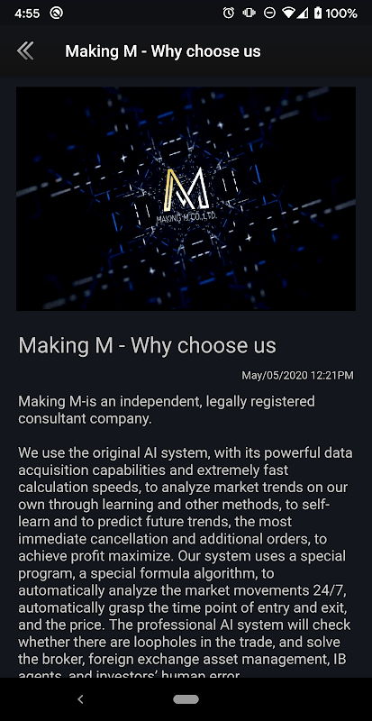 Making M’s original AI investment analysis software provides futures foreign exchange and intelligent investment advisory services, which enable analysis of foreign exchange and investment to be completed at once, thus is perfectly designated for busy and small funded clients.