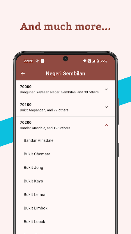 ملائیشیا میں دستیاب تمام پوسٹ کوڈز دیکھیں، جس میں ہر علاقے اور شہر شامل ہیں۔ ایپ تمام 14 ریاستوں کے لیے پوسٹ کوڈ کی معلومات تک فوری رسائی فراہم کرتی ہے۔