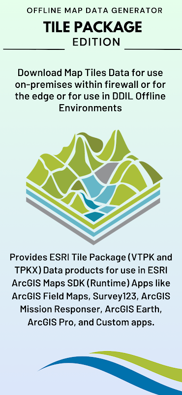 ESRI ArcGIS Maps SDK (رن ٹائم) ایپس جیسے ArcGIS Field Maps، Survey123، ArcGIS مشن ریسپانسر، ArcGIS Earth، ArcGIS Pro، اور کسٹم ایپس میں استعمال کے لیے ESRI ٹائل پیکیج (VTPK اور TPKX) ڈیٹا پروڈکٹس فراہم کرتا ہے۔