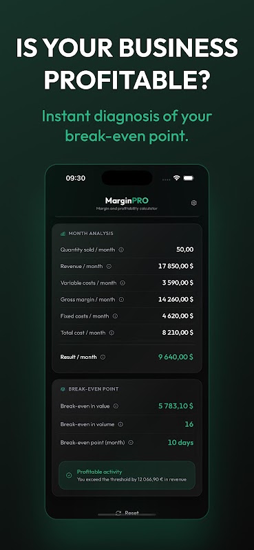 اپنی قیمتوں کو موقع پر مت چھوڑیں۔ مارجن پرو مارجن کا حساب لگانے، فروخت کی قیمتوں کا تعین کرنے اور اپنے وقفے کے نقطہ کو فوری طور پر جاننے کا حتمی ٹول ہے۔ ہر کاروباری کے لیے ضروری معاون۔