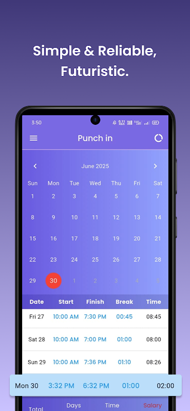 کام کے اوقات کو ٹریک کرتا ہے۔ آپ کا ڈیٹا نجی رہتا ہے اور آپ کے آلے پر محفوظ رہتا ہے۔