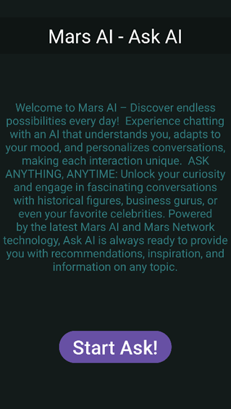 اپنے تجسس کو غیر مقفل کریں اور تاریخی شخصیات، کاروباری گرو، یا یہاں تک کہ اپنی پسندیدہ مشہور شخصیات کے ساتھ دلچسپ گفتگو میں مشغول ہوں۔ جدید ترین Mars AI اور Mars Network ٹیکنالوجی سے تقویت یافتہ، Ask AI آپ کو کسی بھی موضوع پر سفارشات، حوصلہ افزائی اور معلومات فراہم کرنے کے لیے ہمیشہ تیار ہے۔