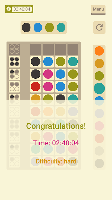 It is a classic code breaker game for two players. One player is codemaker and the other is codebreaker. In this game computer is the codemaker and you are the codebreaker. Computer will generate a random color sequence and your goal will be to guess that secret color sequence as quick as possible. Whenever you put your guess on the board computer will give you hints about your guess that will help you in guessing the secret color code. Those hints will be: