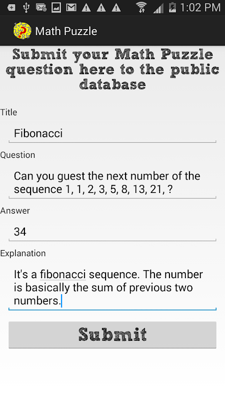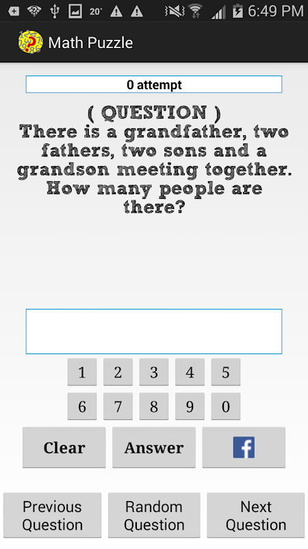 You could also "Ask Friend in Facebook" for question too difficult or just the fun of sharing with them. Feel free to propose enhancement to this apps if you also like math puzzles.