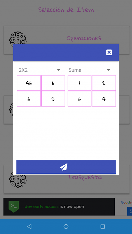 Con esta increíble app podrás conocer y obtener los resultados de operaciones básicas con matrices 2x2, 3x3 y 4x4 ademas de que podrás calcular el determinante y su traspuesta, ¿qué esperas? que el parcial no te detenga tendrás 5 en álgebra lineal