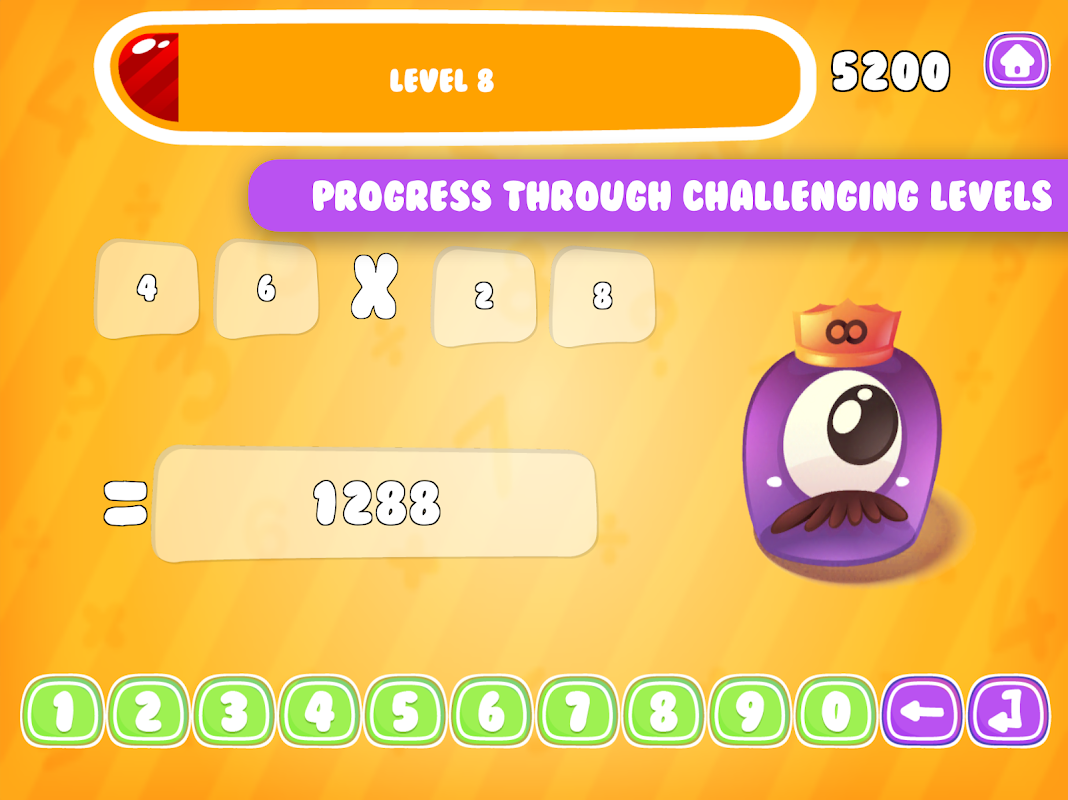 Play along with the awesome monster character and reach higher levels! The monster in this kids learning game gets bigger and more powerful depending on the level you reach. For example, when the character reaches level 2 the - category will be unlocked and when the character reaches level 3 the other + and / will be unlocked. Unlock new levels and collect more points! The more points you collect in this cool math game, the higher level the character gets. Once the monster becomes powerful enough, the math problems will become more difficult all the way up to 4 fields questions!