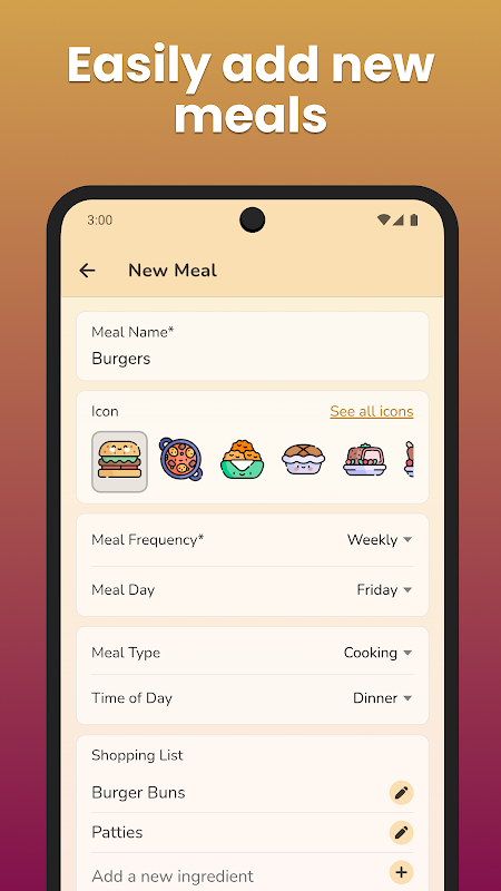 جب آپ نیا کھانا شامل کرتے ہیں، تو آپ کنٹرول کر سکتے ہیں کہ یہ کتنی بار ظاہر ہوتا ہے، یہ کن دنوں سے تعلق رکھتا ہے، اور یہاں تک کہ اسے ایک پیارا سا آئیکن بھی دے سکتے ہیں۔ شاپنگ آئٹمز بھی شامل کریں، تاکہ اسٹور پر جانے کا وقت آنے پر سب کچھ تیار ہو۔