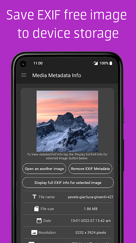 میڈیا میٹا ڈیٹا کی معلومات کے ساتھ، کسی بھی EXIF میٹا ڈیٹا کو اپنی تصاویر سے شیئر کرنے/اپ لوڈ کرنے سے پہلے ہٹا کر اپنی رازداری کے تحفظ میں مدد کریں۔ ایپ اینڈرائیڈ موبائل آلات کے لیے بنائی گئی ہے اور اس میں اختیاری درون ایپ خریداری ہے۔