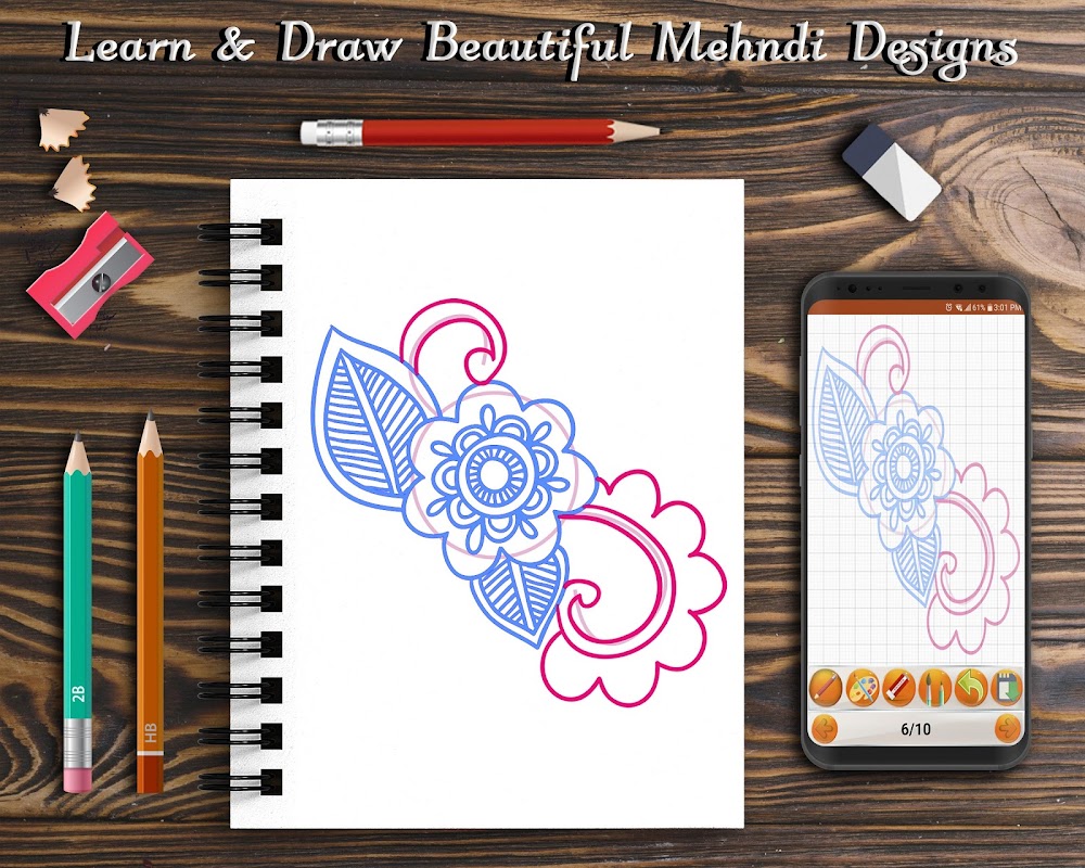 Learn to Draw Beautiful Mehndi designs is a learning app that teaches you How to draw beautiful mehndi patterns step by step. Learn mehndi designs app is fully entertaining and fun activity for teaching you to learn how to draw basic mehndi designs of all types. Every girl loves to draw mehndi tattoos on her skin and with the help of this mehndi app, you can draw latest mehndi designs which will make you look different from others on every occasion.