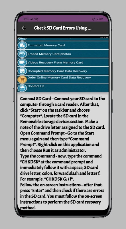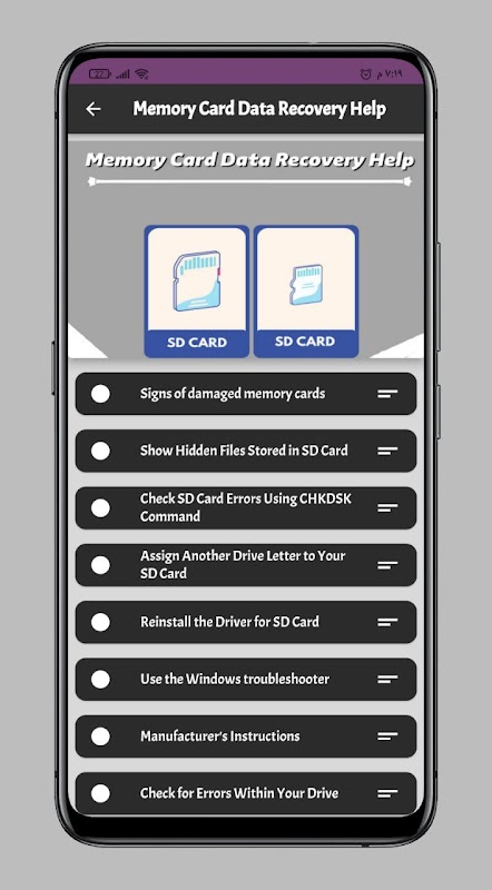 ایپلی کیشن کے ذریعے، آپ میموری کارڈ ڈیٹا ریکوری ہیلپ کو بازیافت کرنے کا طریقہ سیکھ سکتے ہیں، تاکہ آپ اپنا ڈیٹا بازیافت کر سکیں، اور ایپلی کیشن آپ کو میموری کارڈ ڈیٹا کو بازیافت کرنے کے بارے میں بہترین سائٹس اور تجاویز فراہم کرتی ہے۔