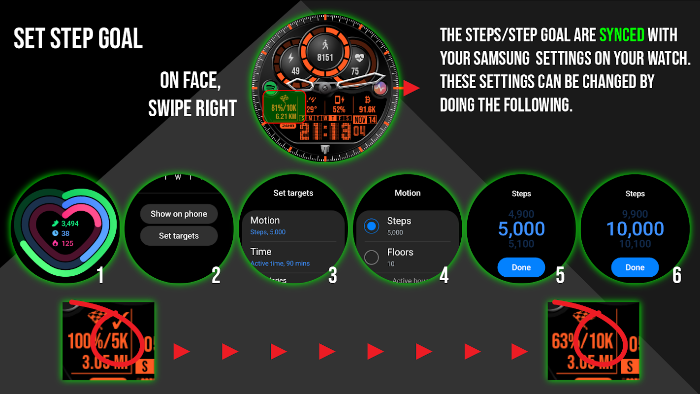 - گرافک اشارے کے ساتھ روزانہ اسٹیپ کاؤنٹر دکھاتا ہے۔ سیمسنگ ہیلتھ ایپ کے ذریعے قدم کا مقصد آپ کے آلے کے ساتھ مطابقت پذیر ہے۔ گرافک انڈیکیٹر آپ کے مطابقت پذیر قدم کے ہدف پر رک جائے گا لیکن اصل عددی سٹیپ کاؤنٹر 50,000 قدموں تک کے تمام مراحل کو شمار کرتا رہے گا۔ اپنے قدم کا مقصد سیٹ کرنے/تبدیل کرنے کے لیے، براہ کرم اس گھڑی کے چہرے کی گوگل پلے کی تفصیل میں دی گئی ہدایات (تصویر) سے رجوع کریں۔ قدموں کی گنتی کے ساتھ کلومیٹر یا میل میں طے شدہ فاصلہ بھی دکھایا جاتا ہے۔ ایک نشان نشان "چیکرڈ پرچم" کے لوگو کے ساتھ ظاہر ہوتا ہے تاکہ اس بات کی نشاندہی کی جا سکے کہ قدم ہدف تک پہنچ گیا ہے۔