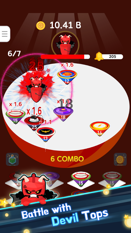 Trying to improve your record in this spinning game? Make sure to merge the tops with the same level to achieve higher levels of the top. The higher level you reach, the more powerful top you will have and the more coins you can collect.