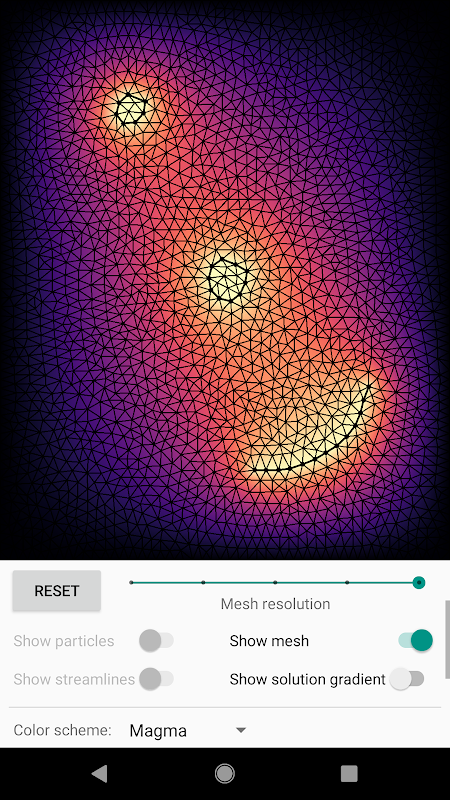 The app also allows you to change the mesh resolution, and offers options for visualizing the solution and its gradient using a variety of different color schemes. meshFlow can generate streamlines and animate particles in the flow, and also offers an "interactive flow" mode where you can manually add particles to any location in the flow.