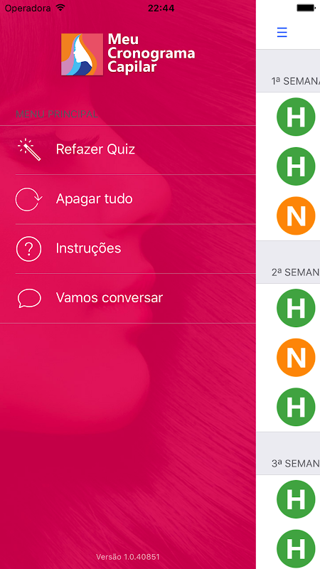 O Meu Cronograma Capilar cria e gerencia um cronograma capilar especialmente feito para o seu cabelo, baseado em um quiz com perguntas e testes para verificar o estado atual de seu cabelo.
