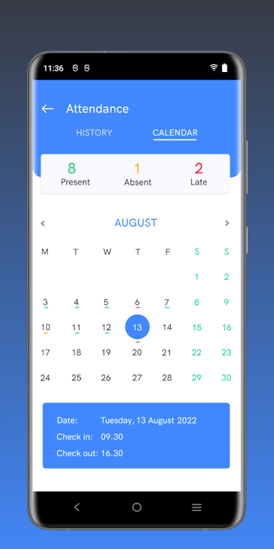 ملازم حاضری کی حالت دیکھ سکتا ہے۔ ایپ آپ کی تنظیم کے ساتھ بڑھتی ہے۔ ملازمین ماہانہ حاضری کی رپورٹس اور تاریخ وار حاضری کی رپورٹس چیک کر سکتے ہیں۔
