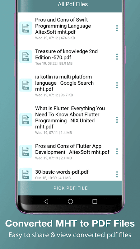 ایم ایچ ٹی ایم ایل ناظرین یا ایم ایچ ٹی ایم ایل ریڈر ایپ کا اپنا پی ڈی ایف ناظر ہے جس کے ذریعے آپ آسانی سے تبدیل شدہ ایم ایچ ٹی کو پی ڈی ایف فائلوں میں دیکھ سکتے ہیں اور ڈیوائس اسٹوریج سے پی ڈی ایف فائل بھی دیکھ سکتے ہیں۔ ایم ایچ ٹی تخلیق کار ایک مفت ٹول ہے جس کے ذریعے آپ کسی بھی ایم ایچ ٹی یا پی ڈی ایف فائلوں کو آسانی سے دیکھ سکتے ہیں یہاں تک کہ اگر آپ کے پاس انٹرنیٹ کنیکشن نہیں ہے۔