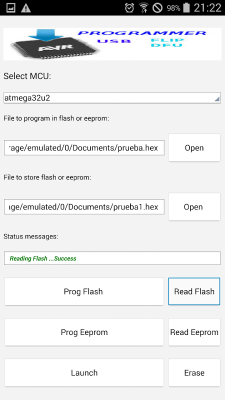 Con esta aplicación podrás grabar y leer la flash del microcontrolador , también podrás grabar y leer la eeprom interna del microcontrolador.