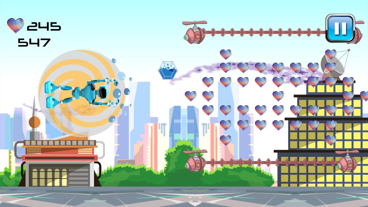 »»»»»»»There is no reason not to click the button and get the one of the best adventure games in the world. Install the top ♥Mighty Robot Hover ♥ on your smartphone and surprise your children magnificently. Organize a contest among them and their friends and they will be as happy as ever. Tell them that the challenge is to reach the highest high score and let them have fun. They will be entertained for hours and you will have enough time to finish all the housework. Do not be ashamed if you too want to play the coolest game because you are an adult because it is made for people of all ages. You will enjoy while you guide impressive hero in the air and collect magnificent hearts. Make a fortune of them and then buy helpful items in the shop. Get the magnificent blue gemstone for speed and you will move super fast and survive impacts. You can also gather it along the way when it appears and use it. You will never again be bored while you play the popular ♥Mighty Robot Hover ♥.
