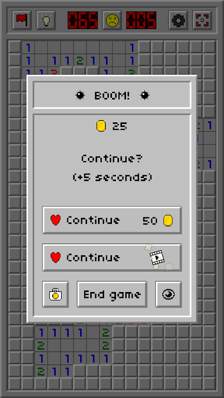 • جاری رکھیں: اگر آپ ایک بارودی سرنگ سے ٹکراتے ہیں تو آپ 50 سکوں کے لیے یا ویڈیو اشتہار دیکھ کر وہیں سے جاری رکھ سکتے ہیں جہاں سے آپ نے چھوڑا تھا۔