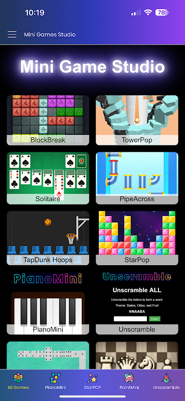 🚀 لامتناہی تفریح، ایک ایپ! ایک مجموعہ میں 50+ نشہ آور منی گیمز سے لطف اندوز ہوں! چاہے آپ کو پہیلیاں، آرکیڈ چیلنجز، تاش کے کھیل، یا دماغی ٹیزر پسند ہوں، Mini Game Studio میں ہر کسی کے لیے کچھ نہ کچھ ہے۔ چلتے پھرتے آرام دہ اور پرسکون گیمنگ کے لیے بہترین!