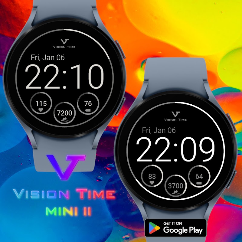 Wear OS کے لیے ڈیجیٹل گھڑی، تاریخ، سٹیپ کاؤنٹر اور ہارٹ ریٹ مانیٹر کے ساتھ ملٹی کلرڈ واچ فیس۔