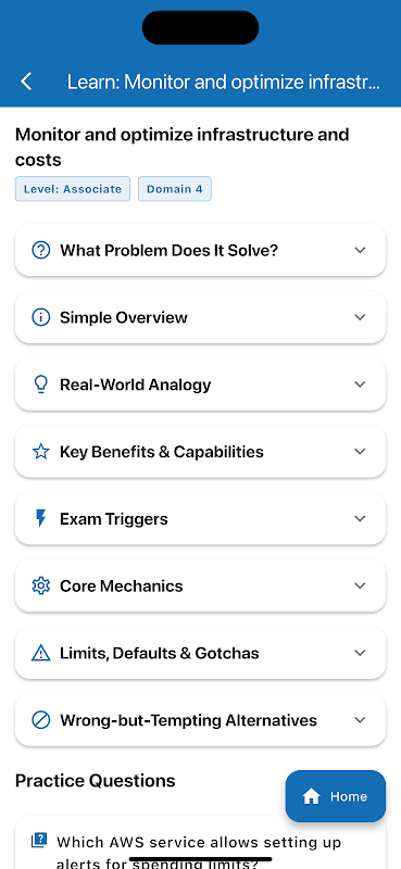 ٹاسک کے لحاظ سے مشق کریں — 4 ڈومینز میں تمام 12 ٹاسک اسٹیٹمنٹس، مکمل طور پر آفیشل ایم ایل اے-C01 امتحان کے خاکہ کے ساتھ منسلک ہیں۔ ڈیٹا کی تیاری، ماڈل کی ترقی، تعیناتی، اور نگرانی کا احاطہ کرتا ہے۔
