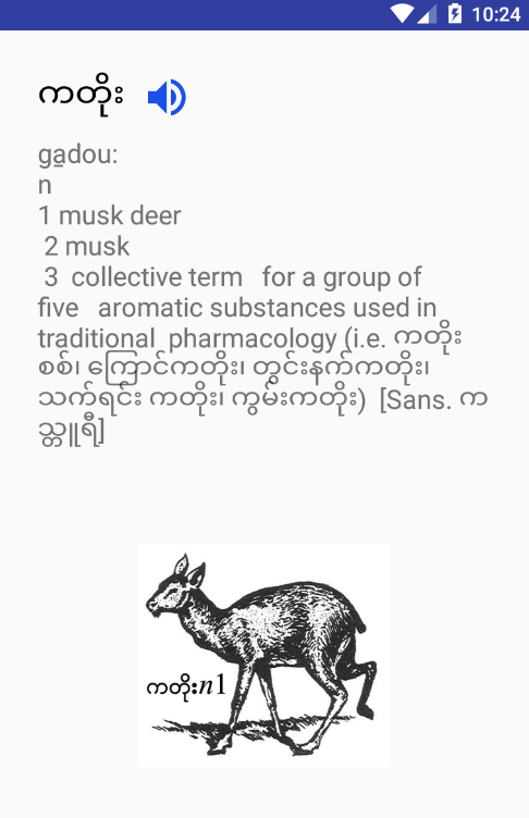 The Myanmar-English dictionary is an offline application. It can be explored the meaning of Myanmar word to English.