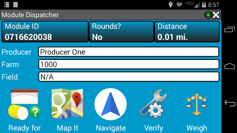 See a map of the module location. Navigate directly to the module. Verify the module via barcode or RFID scanning. Initiate the weigh-in process back at the gin directly from the app.