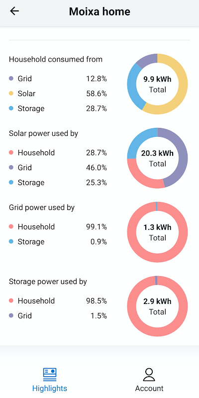 - اپنے گھریلو استعمال اور اپنے مویکسا سے منسلک آلات کے ذریعے بہتی ہوئی طاقت کو دیکھیں ، جس سے آپ کو شمسی توانائی سے پیداواری صلاحیت ، بیٹری کے استعمال اور گرڈ توانائی کے استعمال کی واضح تفہیم حاصل ہوسکتی ہے۔