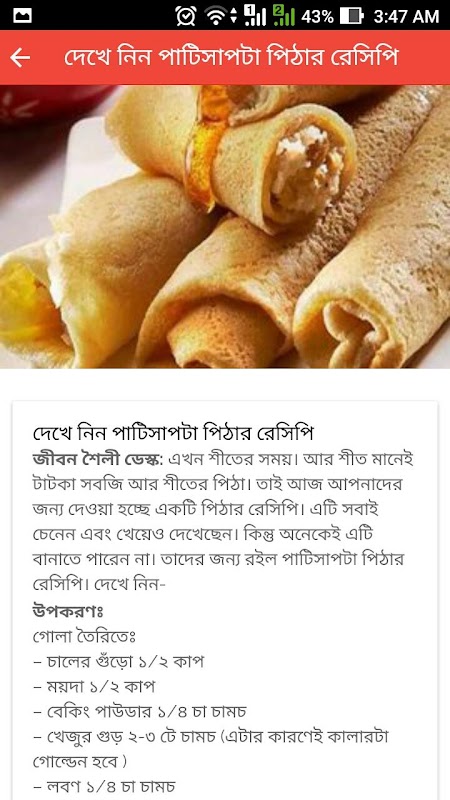 [বাঙ্গালী অনেক ভোজনরসিক। আর ভোজন করতে বা খেতে হলে তো রান্না করতে হবে। আর রান্না করতে হলে জানতে হবে কিছু কৌশল। ডিজিটাল এই যুগে মা-খালাদের কাছ থেকে রান্না শেখার দিন শেষ। অনলাইনেই শেখা যেতে পারে নানা ধরনের রান্না। আর তাই আমরা নিয়ে এসেছি "মজার রান্না" নামের এই এ্যাপসটি। "মজার রান্না" নামক এই এ্যাপসে আপনি পাবেন অনেক ধরনের নতুন রান্নার রেসিপি। তাই আজই ইন্সটল করুন এ্যাপসটি আর পেয়ে যান নানা ধরনের রান্নার কৌশল।]